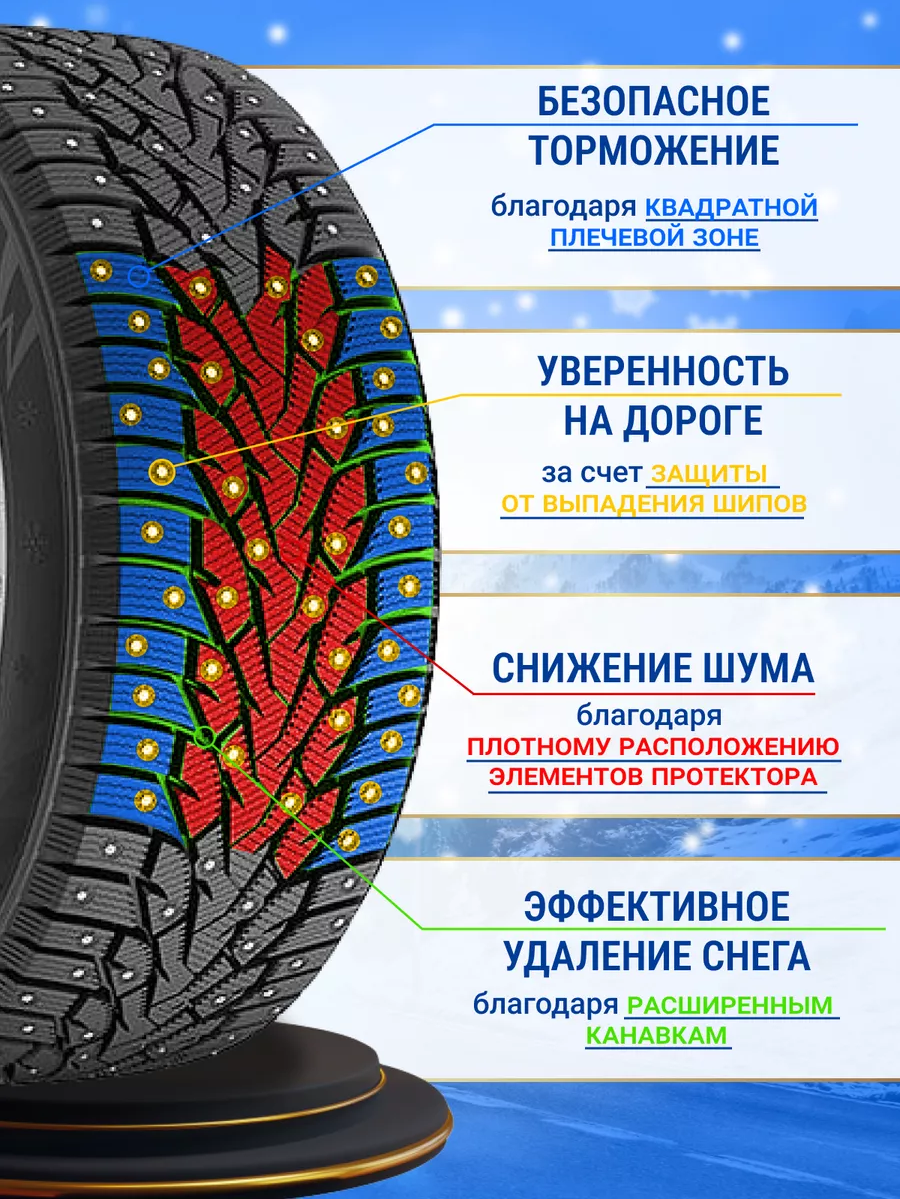 Оптимізоване розташування шипів забезпечує рівномірне зчеплення на льоду під час руху, а спеціальні отвори запобігають випадінню шипів.